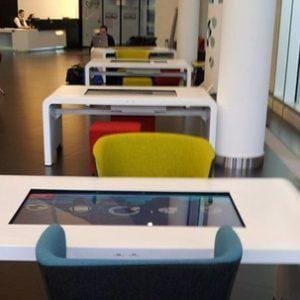 La mesa táctil colaborativa permite que múltiples usuarios interactúen con el contenido desde todos los lados. El diseño de las patas en cascada le da un aspecto moderno y minimalista que se adapta bien a la mayoría de los entornos. Es perfecta para la colaboración con clientes en un entorno empresarial o bancario, museos, presentaciones arquitectónicas e inmobiliarias, exhibiciones de productos o aprendizaje colaborativo en el aula.