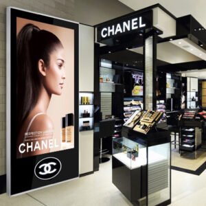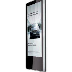 Pantalla de señalización digital de 65″ con resolución 4K ultra alta, diseñada para montaje en pared. Su elegante estructura combina vidrio negro sobre carcasa de acero con paneles laterales de aluminio, ofreciendo un acabado premium y moderno.