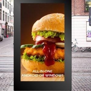 El DS65S es un tótem de señalización digital exterior de una sola cara, diseñado para aplicaciones comerciales de alta gama. Este tótem está disponible como reproductor de medios publicitarios o como una máquina interactiva con pantalla táctil, en versiones de 55″, 65″ o 75″ con pantallas HD de alta luminosidad diseñadas para funcionar las 24 horas del día, los 7 días de la semana. La pantalla está protegida por un vidrio templado seguro AR de 6 mm, con capacidades anti-UV (99,99%), anti-radiación solar (52%) y anti-reflejo, lo que garantiza una excelente visibilidad incluso en condiciones exteriores desafiantes.