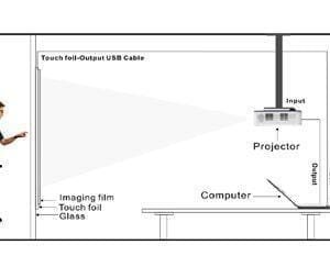 Tecnología Incorporada: Incluye una película táctil capacitiva transparente de 55″, un proyector de alta luminosidad y una computadora, creando pantallas táctiles atractivas en prácticamente cualquier superficie.