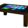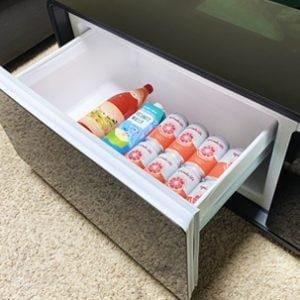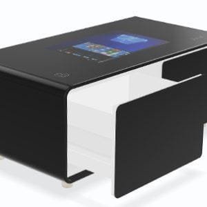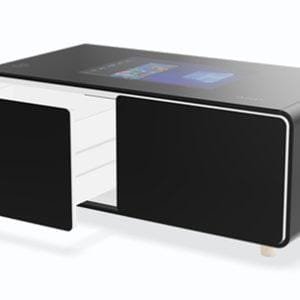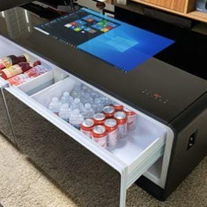 Mesa de centro táctil inteligente para el hogar con 2 cajones refrigeradores, zonas de carga inalámbrica en la superficie de vidrio, sistema de sonido Bluetooth y controlador táctil LED. Disponible en tamaños de pantalla de 32″ o 42″ con pantalla táctil capacitiva de 10 puntos y sistema operativo Android o Windows 10. Hermoso diseño moderno con bordes suaves para prevenir lesiones por golpes. Las patas de goma de 12 mm permiten ventilación y disipación de calor mientras protegen el suelo. La mesa tiene un controlador táctil LED en el lado derecho para ajustar la refrigeración con zonas de temperatura independientes de 33-53°F. La superficie está hecha de vidrio negro endurecido de 5 mm, resistente al desgaste y fácil de limpiar. La parte superior de vidrio negro también cuenta con 2 zonas de carga inalámbrica en los lados derecho e izquierdo de la mesa. Haz clic en la pestaña de video a la izquierda de la descripción del producto para ver una demostración.