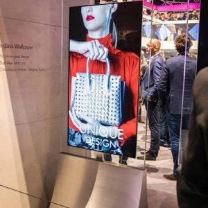 Actualización: Estas increíbles pantallas ahora están disponibles en LCD Ultra Slim de 12 mm a una fracción del costo de la OLED tipo papel tapiz con el mismo aspecto elegante. La opción LCD está disponible colgada en vidrio templado o con base de pie, con resolución 4K, y para uso comercial las 24 horas del día.