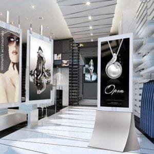 Pantalla de señalización digital OLED de doble cara en vidrio templado tipo papel tapiz. La OLED en vidrio es una opción de pantalla innovadora en la que los paneles OLED están fijados entre dos capas de vidrio templado, una en la parte frontal y otra en la parte posterior. Como la estructura circundante es transparente, la pantalla da la impresión de que la señalización flota en el aire y que la proyección proviene directamente del vidrio. Con su diseño delgado y sofisticado y su doble pantalla, la señalización OLED de LG es una excelente manera de dividir espacios mientras comunicas tu mensaje utilizando ambos lados del panel. El panel es ultradelgado y añadirá un toque de lujo impresionante a tu contenido publicitario. Estas pantallas son ideales para tiendas minoristas, bancos, negocios, aeropuertos, museos, ferias comerciales, hoteles, restaurantes o cualquier situación publicitaria.